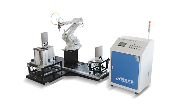 三维激光加工机,充分展示光纤激光器柔性传输的特点,与工业机器人相结合,对三维产品进行空间焊接。